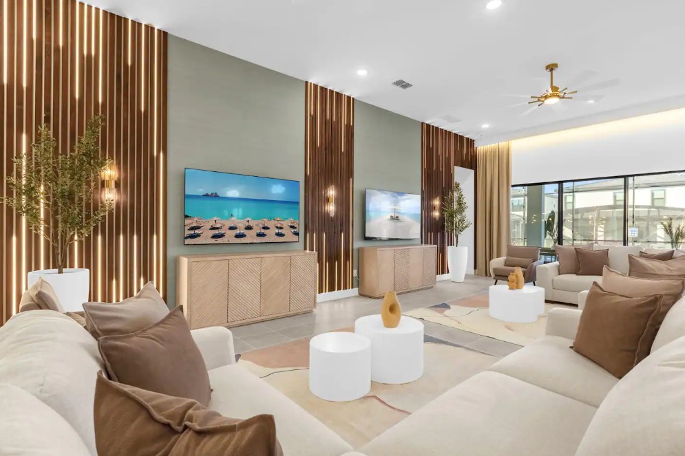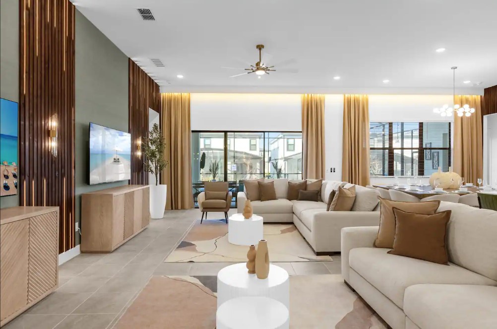 TVs, plush sectional sofas, and a fully equipped chef's kitchen complete with a dining table and a